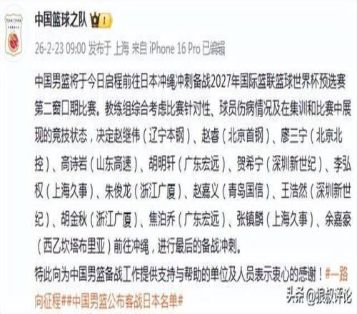 北京時間2月23日,根據(jù)中國籃協(xié)官方的公示,中國男籃將于今日啟程前往日本沖繩沖刺備戰(zhàn)2027年國際籃聯(lián)籃球世界杯預(yù)選賽第二窗口期比賽。教練組綜合考慮比賽針對性、球員傷病情況及在集訓(xùn)和比賽中展現(xiàn)的競技狀態(tài)。