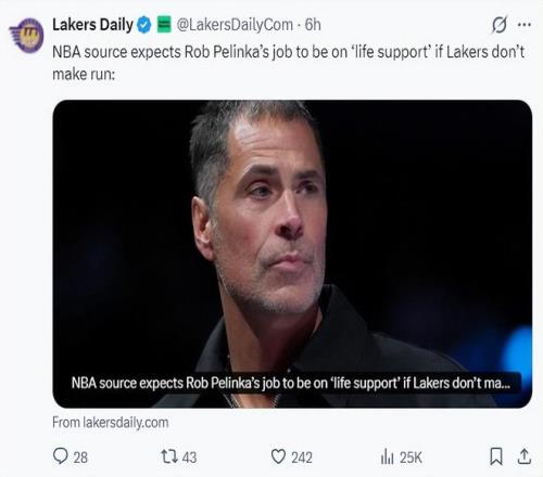 湖媒Lakers Daily甚至表示佩林卡可能已經(jīng)進入了下課倒計時,一旦湖人隊下半賽季、季后賽的戰(zhàn)績不佳,又在休賽期顆粒無收,那么湖人新老板沃爾特很有可能就要對湖人管理層進行清洗,所以佩林卡已經(jīng)開始著手休賽期。