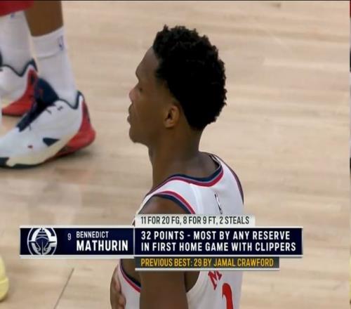 要知道,馬瑟林本場比賽轟下的38分(圖片中的32分是比賽還未結(jié)束時轉(zhuǎn)播方給出的數(shù)據(jù))是快船隊史在主場首秀得分最多的,超過了賈馬爾-克勞福德的29分。