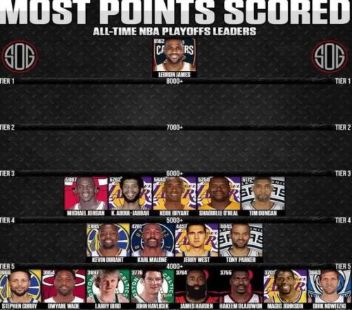 第三個,詹姆斯季后賽總得分8162分。大家常說,季后賽是檢驗巨星成色的舞臺,每一場比賽都是生死戰(zhàn),強度拉滿,老詹能攢下這個分數(shù),靠的是19次季后賽、280多場出場,還有場均近30分的穩(wěn)定輸出?,F(xiàn)役球員中,最接近詹姆斯的球員是杜蘭特,他的季后賽得分為4985分,差了快3000多分,之后的庫里、哈登、倫納德差距更多!年輕球員中,塔圖姆季后賽總得分來到2936分,與詹姆斯差距5000多分,按照塔圖姆的季后賽的平均數(shù)據(jù)來說,每個賽季打13.67場比賽,場均24.1分,每個賽季季后賽合計拿329分,要再拿5000多分,需要塔圖姆再打16年的季后賽,且需要保證自己年年巔峰!顯然,詹姆斯的這份紀錄,后人只能仰望。