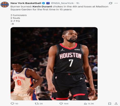 尼克斯媒體:KD在關(guān)鍵時刻掉鏈子,他在末節(jié)發(fā)揮失常,這是他在15年來首次在麥迪遜廣場花園球館輸球。