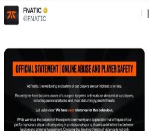 FNC俱樂(lè)部發(fā)布聲明保障選手安全:對(duì)網(wǎng)絡(luò)暴力與死亡威脅零容忍