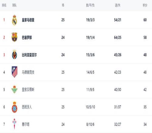 在積分榜上,皇馬依然排名榜首,總積分是60分。排名第2的是巴薩,拿到58分。巴薩少賽一場的情況下落后2分。只要巴薩接下來擊敗萊萬特,就能夠登頂。比利亞雷亞爾以48分排名第3。第4的是馬競,也是48分?;始邑惖偎?2分排名第5。