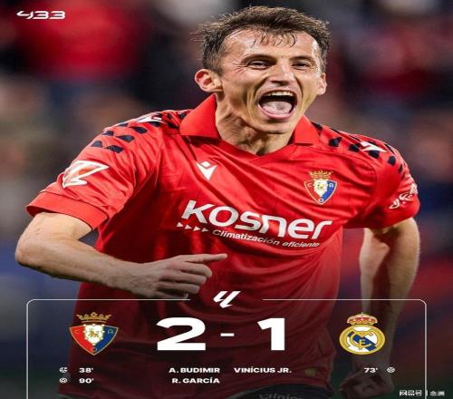 西甲第25輪,皇馬客場(chǎng)1-2奧薩蘇納,聯(lián)賽8連勝終結(jié),先賽一場(chǎng)2分領(lǐng)跑。布迪米爾造點(diǎn)+點(diǎn)射,姆巴佩小角度破門但越位在先無(wú)效,巴爾韋德助攻維尼修斯扳平,勞爾-加西亞絕殺。