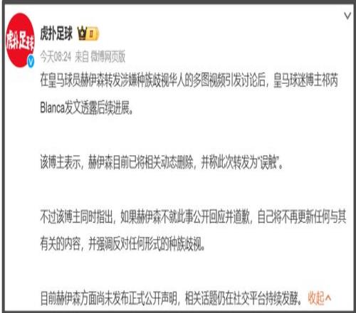 輿論升級過程中,有一位網(wǎng)紅博主嘗試聯(lián)系皇馬俱樂部和赫伊森本人,都沒有得到正式回應,繞了一圈聯(lián)系了赫伊森的隊友,也就是皇馬俱樂部其他球員,才被告知是赫伊森不小心碰到了才轉(zhuǎn)發(fā)的,包括刪除動態(tài),都是赫伊森隊友和赫伊森媽媽提醒的——他媽媽來了!他媽媽真的來了!