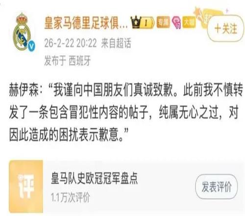 2月22日,皇家馬德里足球俱樂部官方微博發(fā)布道歉聲明,轉(zhuǎn)述豪森的回應(yīng),稱此事“純屬無心之過”。豪森表示:“我謹(jǐn)向中國朋友們真誠致歉。此前我不慎轉(zhuǎn)發(fā)了一條包含冒犯性內(nèi)容的帖子,純屬無心之過,對因此造成的困擾表示歉意?!?/p>