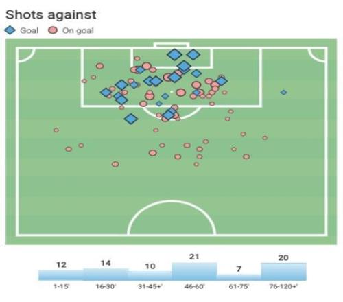 如果現(xiàn)在再回看迪亞斯的參與進(jìn)球和參與制造得分機(jī)會完整點(diǎn)位圖,你會發(fā)現(xiàn),迪亞斯最有威脅的時(shí)間主要集中在下半場前半段和后半段,這兩個(gè)足球比賽尤為關(guān)鍵的時(shí)期。本賽季,拜仁在落后或膠著的比賽中,迪亞斯貢獻(xiàn)7球4助,獨(dú)造11球,占球隊(duì)膠著局進(jìn)球數(shù)的42%。迪亞斯的所有數(shù)據(jù),都是在全德甲所有球員壓力值最大的情況下取得的,即便這樣他也竟然也值是本賽季德甲場均評分第二的左邊鋒,但所有數(shù)據(jù)都能證明迪亞斯有一顆大心臟。