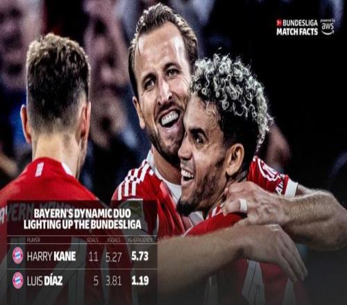 能力三:得分。當(dāng)你時(shí)不時(shí)吐槽迪亞斯浪費(fèi)單刀時(shí),你也需要看到迪亞斯的場均射門比利物浦是時(shí)期多了整整1/3。更強(qiáng)的射門欲絕不是說明迪亞斯有多“獨(dú)”,如果拆開看迪亞斯的參與進(jìn)球和參與制造得分機(jī)會完整點(diǎn)位圖,你會發(fā)現(xiàn)迪亞斯一點(diǎn)都不自私,而且他制造進(jìn)球的潛力還有很大。而下圖是則是德甲第六輪后拜仁兩大神鋒預(yù)期進(jìn)球和實(shí)際進(jìn)球區(qū)分?jǐn)?shù)據(jù),不難發(fā)現(xiàn),迪亞斯的射門權(quán)是自己爭取而來的,他憑借賽季初遠(yuǎn)高于預(yù)期進(jìn)球的表現(xiàn)贏得了孔帕尼對其射門的放權(quán)。同樣,也必須認(rèn)可迪亞斯的得分能力,比如對陣柏林聯(lián)合到底起身后的零度角;還有上輪面對曹法爾防守小幅度擺腿內(nèi)切,推射球門右下角;還有一次次禁區(qū)中路內(nèi)搶點(diǎn),亦或者橫向帶球內(nèi)切……迪亞斯的得分手段之多,令人咂舌。
