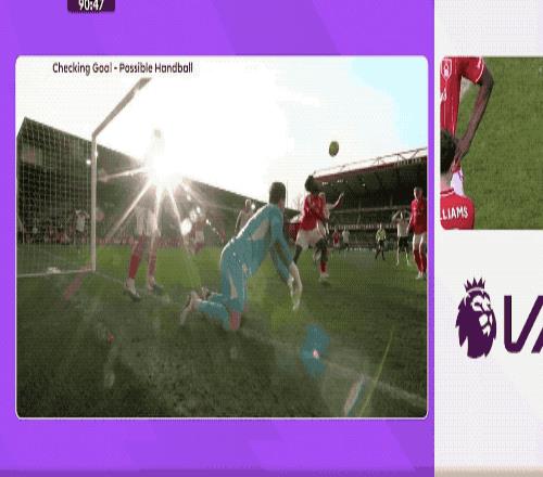 第90分鐘,恩古莫哈傳中,?;倏说念^球被奧爾特加奮力撲出,埃納大腳解圍,麥卡利斯特背身,皮球打在他的手臂上,彈進(jìn)球門。VAR介入,裁判認(rèn)定進(jìn)球無(wú)效。