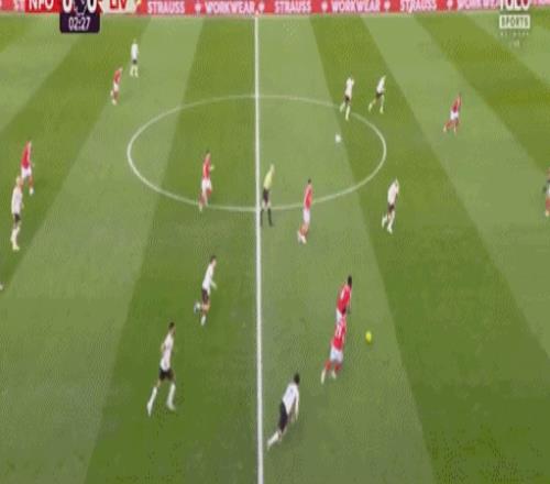 開場(chǎng)3分鐘,瓊斯中場(chǎng)回傳失誤,桑加雷送出過頂長(zhǎng)傳,奧多伊單刀挑射被阿利松撲出。