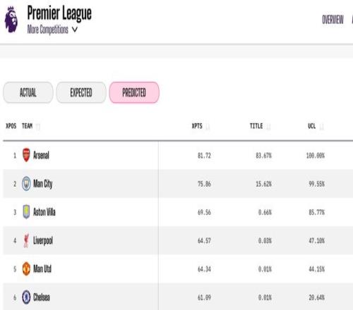 Opta超級(jí)計(jì)算機(jī)的模型也計(jì)算了各隊(duì)進(jìn)入“英超前四”的概率。盡管阿斯頓維拉近期狀態(tài)有所下滑,但由于前期積累的優(yōu)勢(shì),他們?nèi)杂?5.7%的高概率進(jìn)入前四;利物浦的概率為47.1%,而曼聯(lián)緊隨其后,概率為 44.1%。